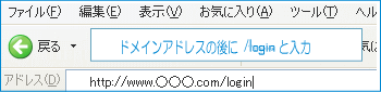 IE(インターネット・エクスプローラー)を開き、アドレス入力欄に取得されたドメイン名を入力し、/loginと続けて入力して下さい。(入力後Enterキー押す) |