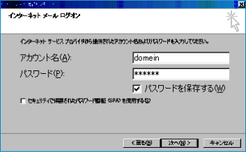 アカウント名のところに「ユーザ名」(IEから新規登録した)をパスワードには、これも新規作成したご自分のパスワードを入力して下さい。 「次へ」に行き、これで一通り完了です。